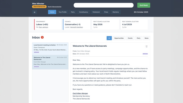 Contest council elections ward by ward. Organise your campaign team. Allocate your budget between leaflets, canvassing and advertising. Manage volunteers. Win or lose based on demographics, national swing, your party's platform, and how effectively you campaigned.