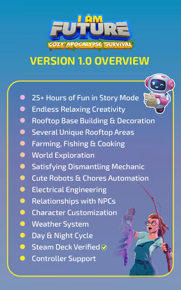 I Am Future is a relaxing single-player survival game about building a cozy rooftop camp amid a flooded post-apocalyptic city. Set up a farm, go fishing, tinker with gadgets, craft new tools, manage a team of cute robots to automate and expand your base, explore the mysterious world, and chill out!